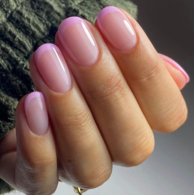 Неизменно популярный в теплое время года цветной френч может выглядеть более нежно, если сделать его менее контрастным. Например, выбрать нежно-лиловый оттенок кончиков и прозрачно-лиловый основной цвет ногтей, а линию свободного края выделять при помощи тонкой кисти.