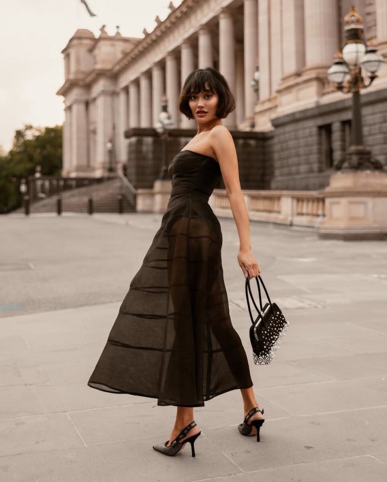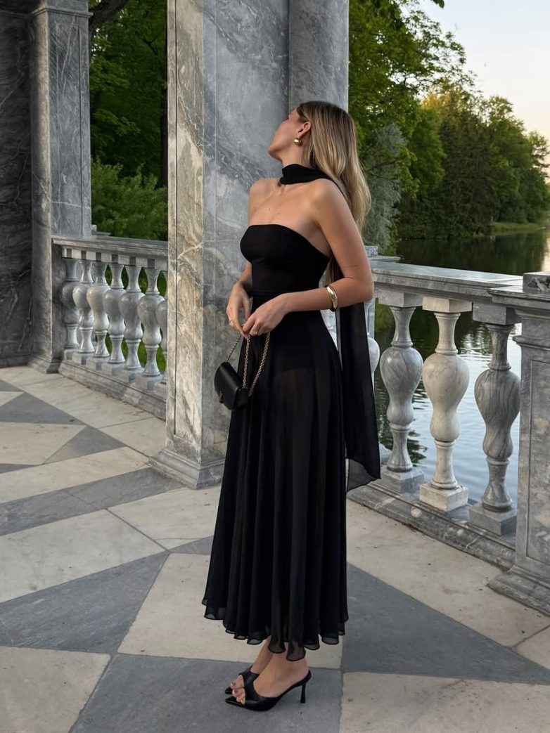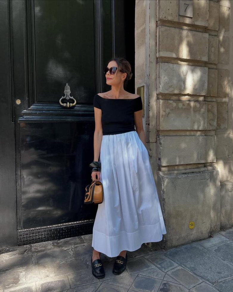 Ключ к успеху в добавлении женственных элементов в образы – в соблюдении баланса между женственной ретроэстетикой и современным небрежным стайлингом. Носите пышную юбку А-силуэта с базовой белой футболкой и кедами. Элегантное платье в стиле 50-х дополните грубоватыми сандалиями или минималистичной сумкой. Именно такое сочетание разных эстетик сделает образ по-настоящему свежим и современным.