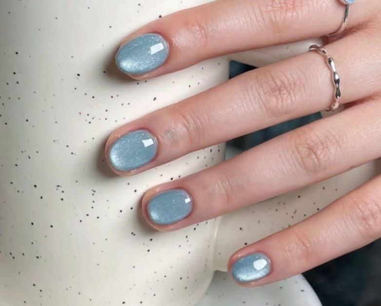 Прозрачное, как утреннее море во время рассвета, покрытие ногтей «кошачий глаз» в светло-голубом оттенке – идеальный вариант для тех, кто любит нежный маникюр, не перетягивающий на себя все внимание.