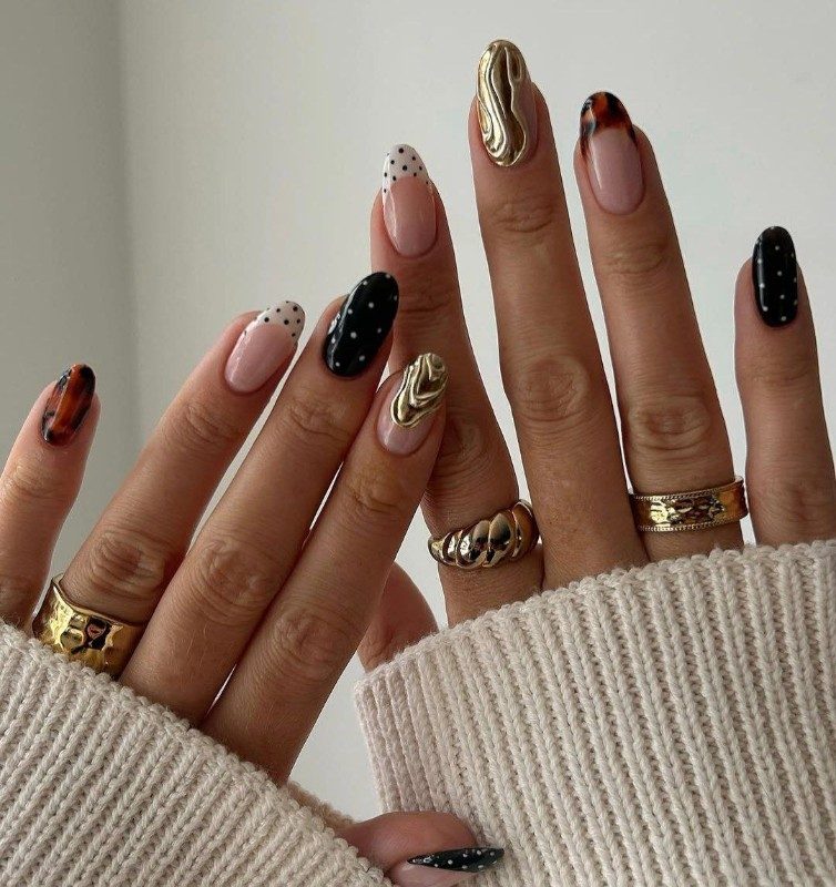 Интересная идея – отзеркалить цвета на разных руках. На одной сделать черные кончики в белый горошек, на другой – белые в черный.
