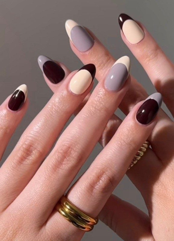 Для такого френча подойдут любые цвета, не бойтесь экспериментировать: нейл-инфлюенсеры рекомендуют замиксовать серый с ванильным, шоколадный с серым, молочный с коричневым.