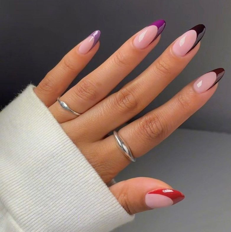 Зачем ограничиваться одним или двумя цветами, когда можно собрать на ногтях всю осеннюю палитру? Попробуйте накрасить каждый кончик ногтя по-разному, используя модные цвета осени – бордовый, сливовый, шоколадный, пыльно-лавандовый.