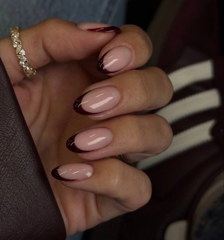 Бордовый френч требует безупречной формы ногтей. Он отлично смотрится на миндалевидной и овальной форме, но может утяжелять короткие квадратные ногти.