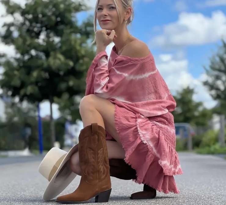 Главное правило — штанина должна накрывать голенище хотя бы на треть. Прямые и bootcut вытягивают силуэт, мягкий клеш делает образ более графичным. Добавьте ремень с пряжкой и белую рубашку или хлопковый лонгслив — получится «чистый» городской вестерн без лишней декоративности.