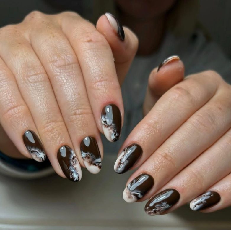 Мраморный дизайн – черный кофе с молоком – оригинальная идея для осеннего маникюра: ненавязчивая и необычная одновременно.
