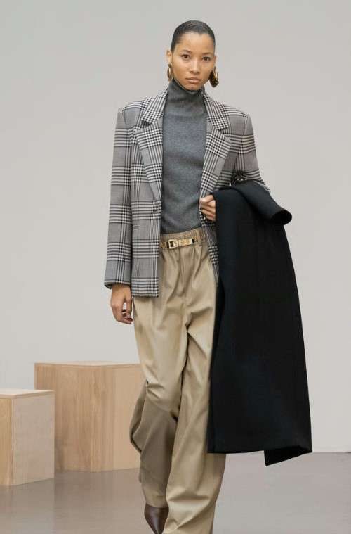 Чего больше всего не хватает в офисе осенью? Домашнего уюта. Конечно же, мы не предлагаем заворачиваться в пушистые пледы за рабочим столом, но подобрать деловой образ, который настроит как на бизнес-лад, так и подарит немного тепла — почему бы и нет? Присмотритесь к тенденции создавать комплекты на основе теплой цветовой гаммы — серо-коричневого, бежевого, нюда, шоколадного, золотистого. Мы обожаем образ от Brandon Maxwell: тонкая водолазка с высоким горлом, широкие брюки песочного тона и прямой пиджак в актуальную в этом сезоне классическую клетку — идеально как для рабочих будней, так и для прогулок в парке после трудовых подвигов.