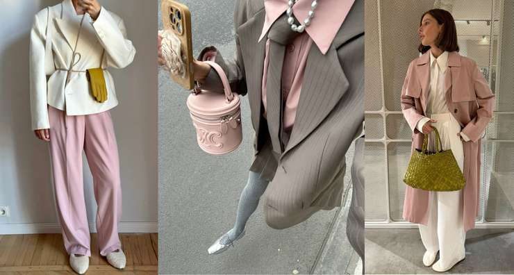 Нежный и «воздушный» цвет, который словно смягчает реальность. Пудровый розовый вернулся не как символ девичества, а как оттенок комфорта и психологического спокойствия.С чем работает лучше всего: серый трикотаж, хаки, молочный, карамель и даже серебро. Он прекрасно звучит в тотал-луке, но и в деталях производит эффект: розовая сумка на фоне серого пальто сразу делает образ теплее и более женственным.