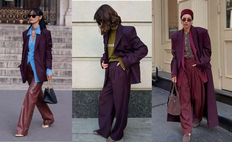 — Для офиса: mocha в костюме или брюках, розовый свитер под жакет и маленький акцент в aubergine — например, сумка или обувь.