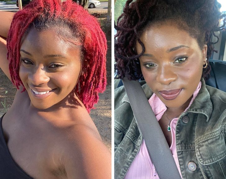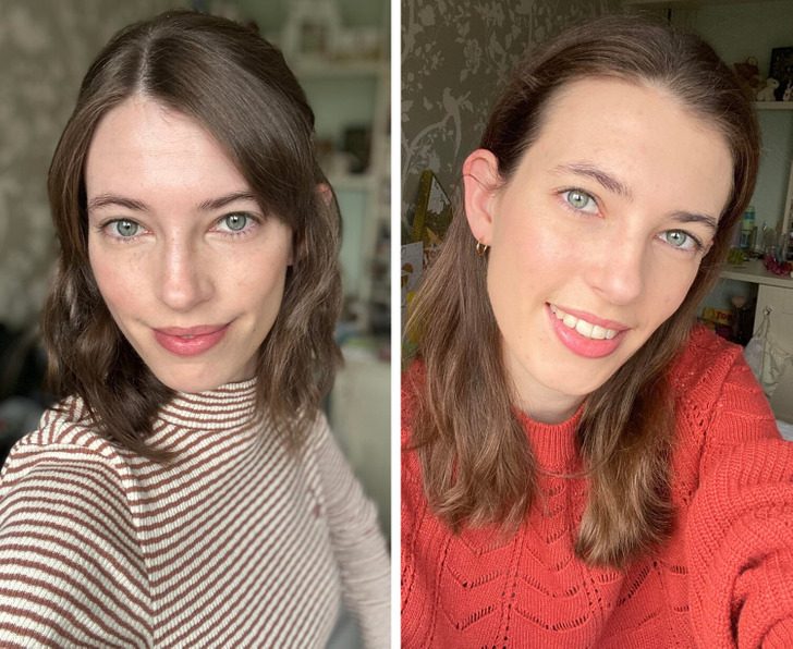 «До и после определения моего цветотипа. Мой тип — „Осень“. Эти фотографии сделаны с разницей в 40 минут. Чувствую себя куда здоровее»