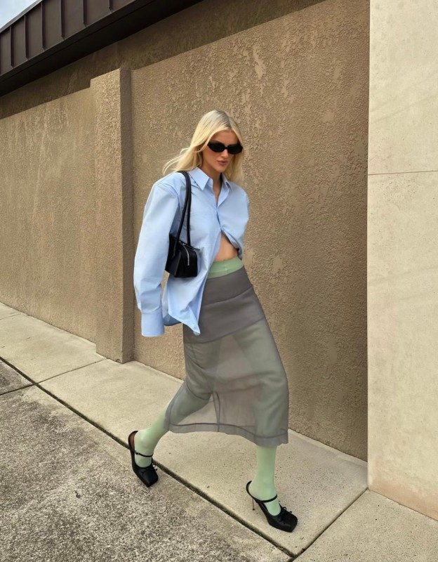 Как совместить комфорт и стиль? Ответ простой: цветные колготки — тренд осени 2025. Фиолетовые, голубые, белые, с разными узорами и кружевные — их можно сочетать с юбками и платьями. А если сверху надеть пальто, то получится невероятно модный и согревающий образ.