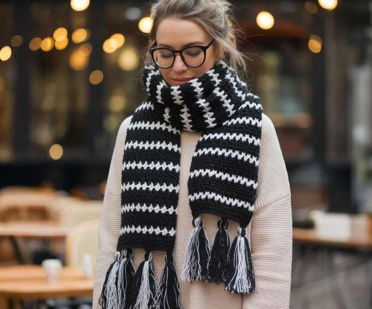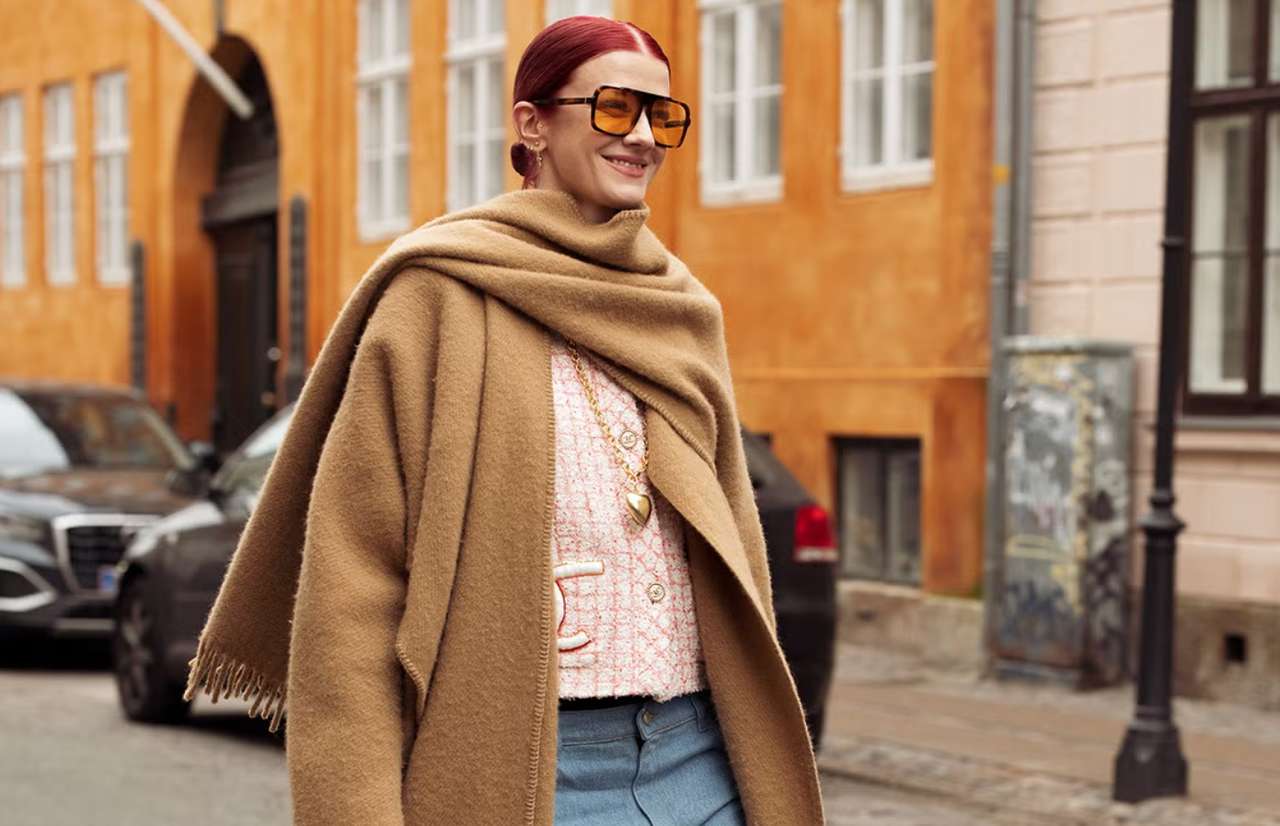 Зима 2025−26 — про крупную вязку: косы, «бочечки», фактурная резинка. Такие шарфы легко становятся центром образа, даже если остальной комплект минималистичен. «Носите их с пальто классического кроя — черное или camel — и делайте акцент на фактуре: пусть шарф играет, а не теряется. Добавьте тон в тон шапку бини или гладкую повязку, чтобы усилить вертикаль и визуально вытянуть силуэт. Если верх очень фактурный, оставьте низ очень спокойным (вплоть до обуви), тогда шарф будет работать как единственный арт-объект», — предлагает эксперт.
