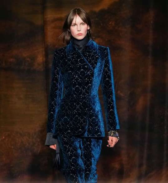 Расслабленный и атмосферный богемный стиль сам по себе находится на вершине популярности этой осенью, а уж бохо-образы, построенные с включением вельвета, обретают статус легенд. Бахрома, юбки-трапеции и солнцеклеш, клешеные же брюки, рубашки с удлиненными воротничками, платья-туники — только представьте себе, как изысканно и необычно будут смотреться эти вещи в бархатистом материале. Так, флагман бохо-эстетики, марка Etro, представила костюм-двойку, в который можно вложиться как в модную инвестицию: прямые брюки глубокого коричневого цвета будут актуальны всегда, в то время как пиджак с длинной бахромой от талии станет играть роль модного акцента. Ударились в цыганскую эстетику и Burberry — чего стоит золотой вельвет, который лидер бренда Дэниел Ли включил почти во все выходы. Разумеется, самыми запоминающимися стали два комплекта: расслабленная туника-рубашка в черно-золотом сочетании и золотой ворсистый брючный костюм. Богато, смело и очень, очень модно! Наконец, настоящий мастер-класс по созданию истинно богемных образов из вельвета с набивным принтом (к слову, популярный пейсли — тот самый «турецкий огурец») продемонстрировала креативная команда марки Ralph Lauren: платье-рубашка с рукавамифонариками из ткани в косой рубчик выглядело на подиуме настоящим шедевром.