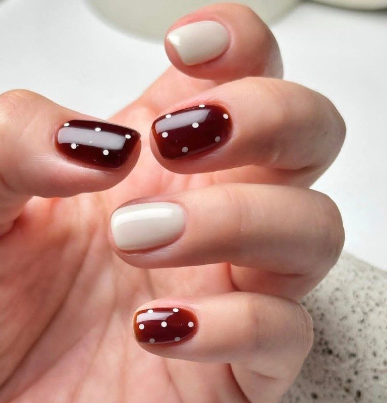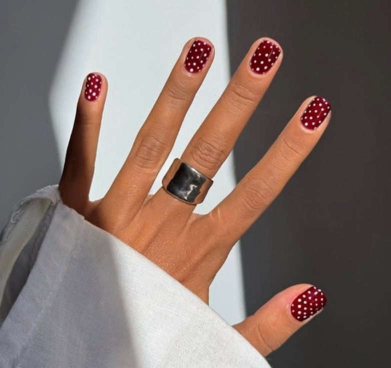 Нейл-дизайнеры предлагают рисовать «полька-дот» на всех ногтях либо украшать горошком несколько. Лучше всего сочетать бургунди с белым контрастным лаком.