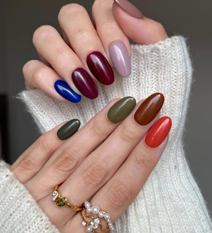 Вы можете по 40 минут перебирать палитры в поисках того самого оттенка? Так почему бы не замиксовать несколько модных осенних цветов в одном маникюре? Приветствуются максимально оригинальные сочетания: например, бордовый, темно-синий, пыльно-фиолетовый, тауп, хвойный.