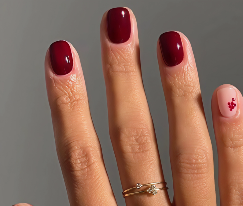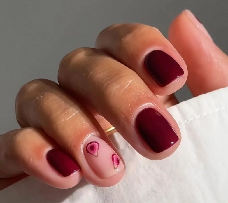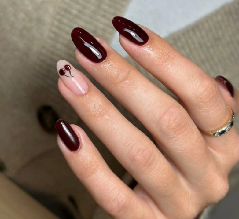 Виноград, вишня, инжир, яблоки – любые фрукты и ягоды бордового оттенка станут идеальным дополнением дизайна маникюра. Проще всего рисовать вишни, при этом выглядят они максимально эстетично.