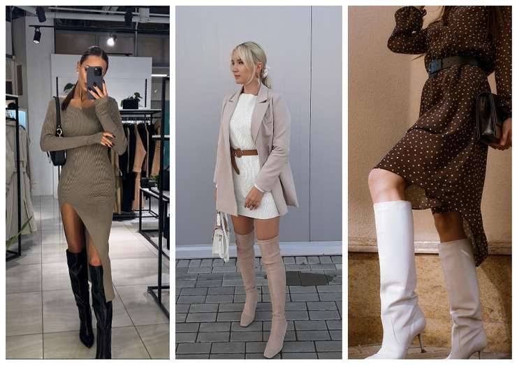 С платьямиЭто, пожалуй, самое элегантное и женственное сочетание. Сапоги прекрасно дополнят струящиеся платья из шелка, бархата или трикотажа. Особенно выигрышно смотрятся модели с разрезами, которые позволяют продемонстрировать ваши сапожки, это самый безопасный и элегантный вариант. Платья миди из трикотажа, шерсти или шелка идеально сочетаются с длинными сапогами. Рискованный, но стильный вариант.
