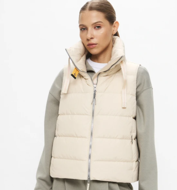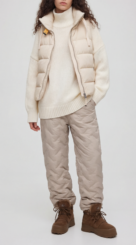 Удобный способ собрать городской зимний образ. Он добавляет тепло, но оставляет свободу движения и не перегружает верх. В городе его носят поверх костюма в стиле sport chic, свитера, худи или тонкого пуховика; в мороз – под пальто.Такой слой работает как архитектурный акцент: он формирует объем в верхней части силуэта и делает образ более актуальным. Жилет хорошо сочетается с прямыми шерстяными брюками, плотными леггинсами и джинсами, особенно если вся гамма выдержана в одном тоне.