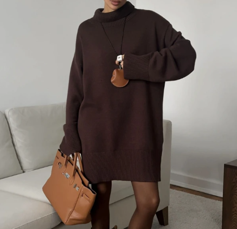 Это основа городского apres-ski и многослойности. Выбирайте модели из шерсти или кашемира: объемные, с высоким воротником, плотные, держащие форму. Такой свитер можно надеть под пуховик или жилет, сочетать с прямыми брюками, широкими джинсами, плотными леггинсами или юбкой миди.Можно заправить его в брюки или джинсы, чтобы добавить структуру. Важно, чтобы низ был спокойным: свитер сам собирает весь образ.