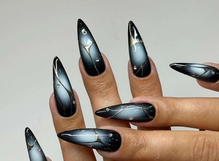 Еще один тренд — «дымка», когда черный постепенно растворяется в прозрачной или серой базе. На коротких ногтях такой маникюр смотрится мягко и интеллигентно, на длинных — гипнотически. Это идеальный вариант для тех, кому хочется черный, но с нюансами и глубиной. А если сердце просит чуть больше смелости — можно добавить едва заметный шиммер, который заиграет только при свете.