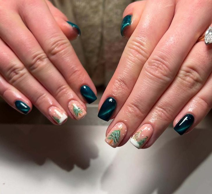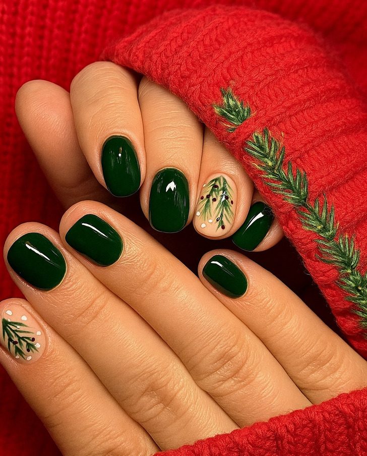 Темно-зеленый цвет хвои выигрышно смотрится в любое время года, но зимой это один из главных фаворитов. Попросите свою мастерицу нарисовать пару веточек и вуа-ля! — вы лесная загадочная фея.