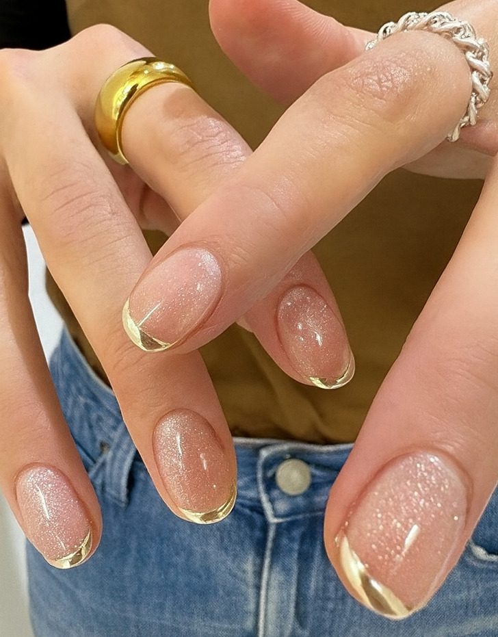 Если вы мечтаете о французском маникюре, но хотите что-то по-настоящему зимнее, попробуйте насыщенный коричневый или красный, а еще лучше золотой кончик, тем паче, что и бургунди и коричневый сейчас в топе трендов. Ну а праздника добавит френч с блестками, куда ж без них — получится настоящий зимний шик