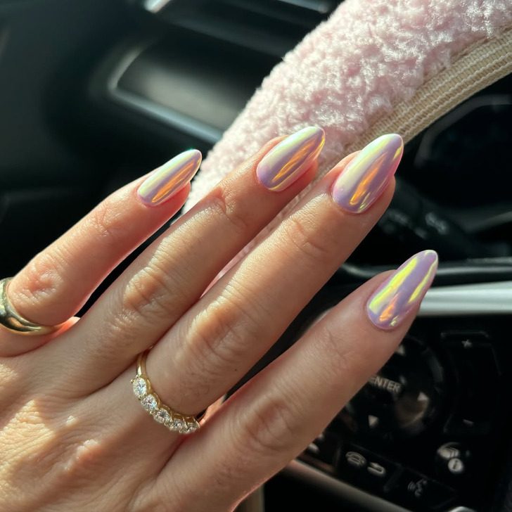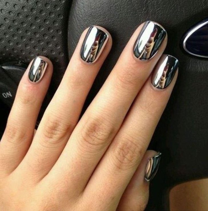 Идеальный зеркальный эффект. На ногтях можно сделать хаотичные серебряные капли, хитроумный френч или полностью металлизированное покрытие (я выбираю второе). Полностью зеркальные ногти — отвал всего, как по мне. Можно и губы подкрасить, и посмотреть, что за спиной творится.