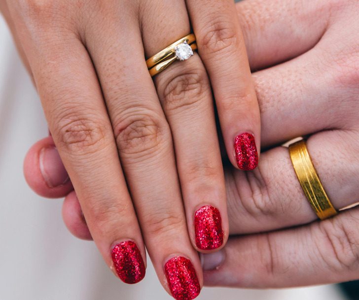 Вместо классического красного опять же этой зимой предлагают магические, ой, магнитные варианты. Это и выглядит хорошо, и с золотыми кольцами сочетается. Но обычные блестки и уход в морковные оттенки нужно использовать в меру, со вкусом, иначе будет плохо получаться на фотографиях.