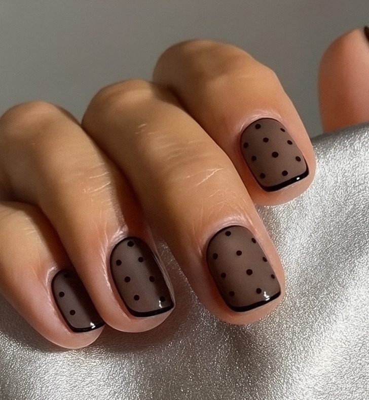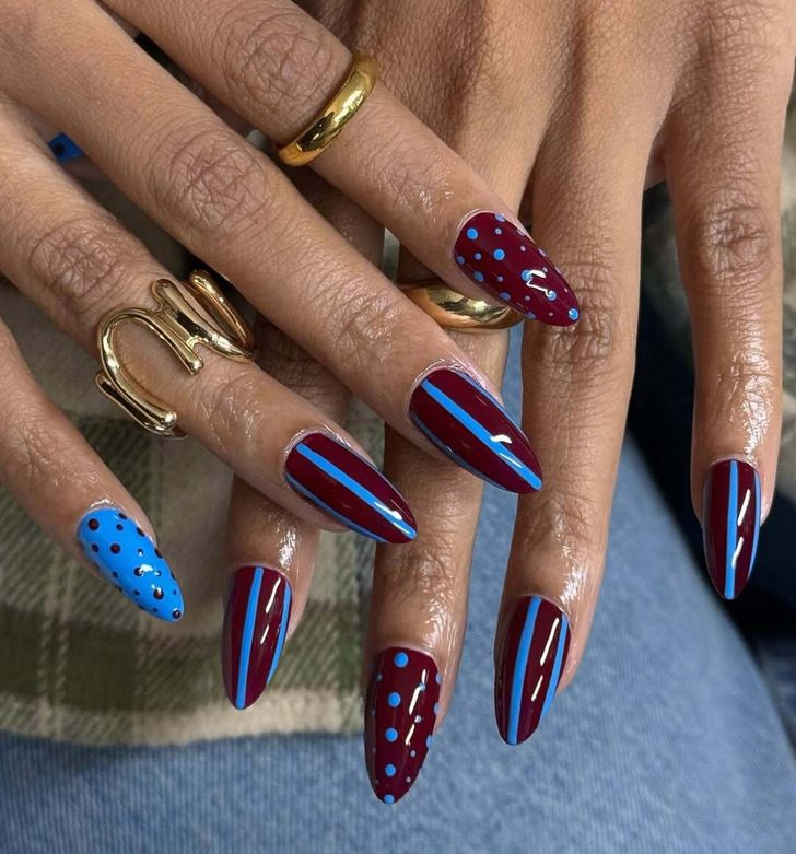 Горошек стал одним из главных трендов маникюра уходящего года, и он особенно актуален зимой, если поэкспериментировать со светлыми и темными оттенками. Попробуйте светлую основу с темными точками на одной руке, а затем измените сочетание на другой. Кстати, полоски этой зимой актуальны как никогда — ведь они так напоминают теплый зимний свитер.