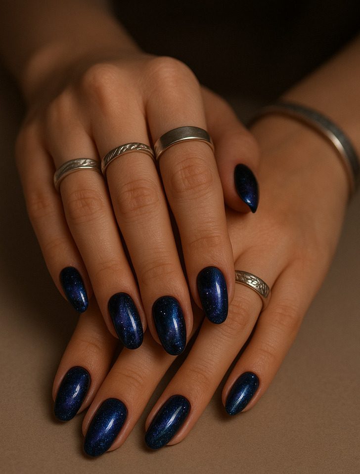 Космос на ногтях с эффектом «кошачьего глаза», что может быть лучше? Эти ногти будут как зимнее небо в морозную ночь. Тем более, что этот эффект сейчас используется сейчас довольно часто.