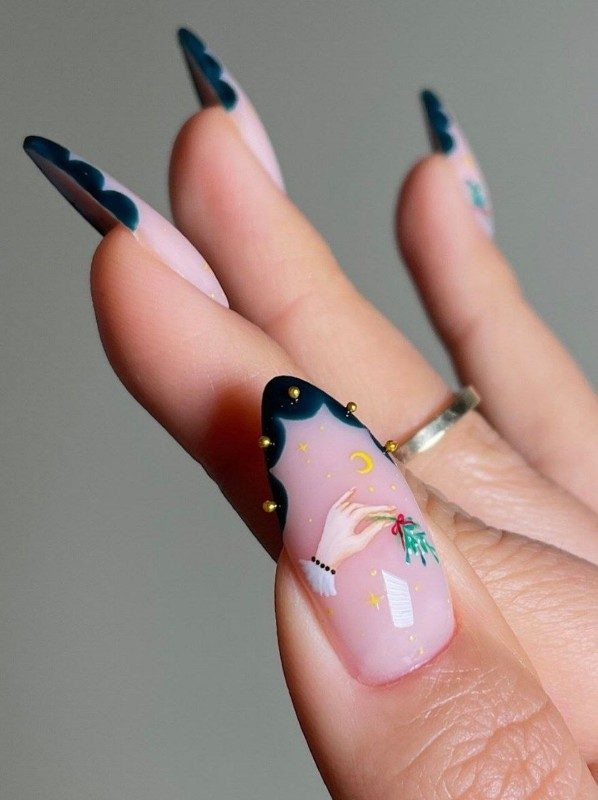 Один из самых популярных оттенков цветного френча в декабре 2025, цвет новогодней ночи – глубокий синий. Он не выглядит «грязно», красиво сочетается с блестящими лаками и рождественскими украшениями.