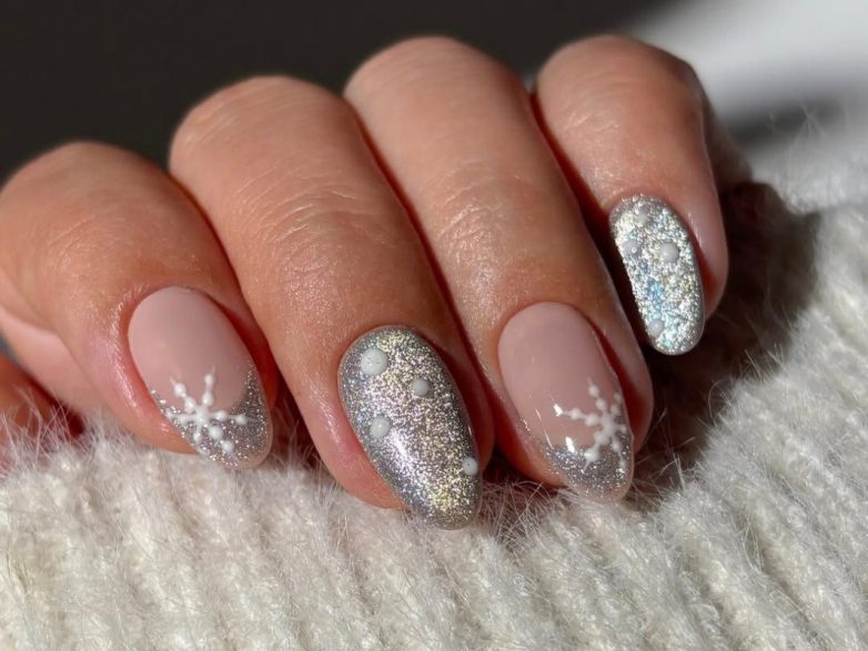 Объемные белые снежинки поверх серебряного лака – удачный выбор для тех, кто любит тактильные узоры.
