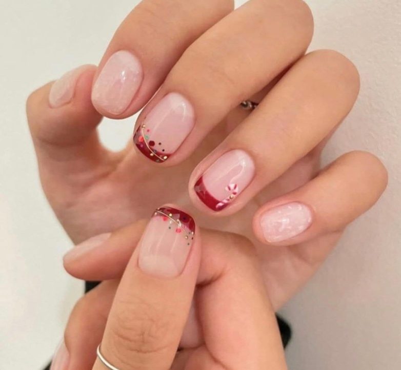 Идея для минималистов, которым тоже хочется добавить в маникюр немного новогоднего вайба, – сделать красный френч на парочке ногтей, украсив его миниатюрной гирляндой, а остальные ногти покрыть нюдовым полупрозрачным лаком.