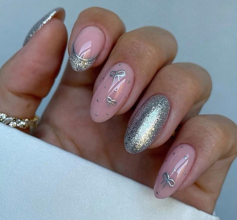 Не любите стандартные новогодние рисунки? Тонкие бантики – тоже вполне уместны. Попробуйте сделать французский маникюр серебряным лаком с мелким шиммером, а бантики и узоры нарисовать хромированным лаком без блесток. Разница текстур смотрится интересно.