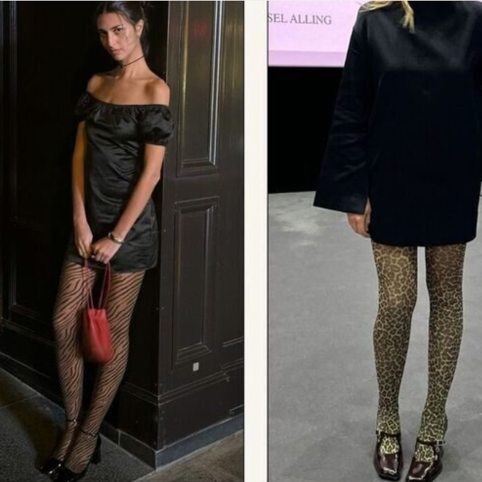 Второе правило: экспериментируй с узорами и текстурами. Простые гладкие колготки? Нет! Теперь в моде принт, кружево, сетка и даже имитация вязки. Они добавляют романтики и объема. Сочетай узорчатые колготки с платьем в стиле преппи — плиссированной юбкой и ботинками на толстой подошве. Или надень кружевные под миди-платье с объемными рукавами: это романтично и современно. Избегай перегрузки: если колготки с принтом, платье пусть будет однотонным.