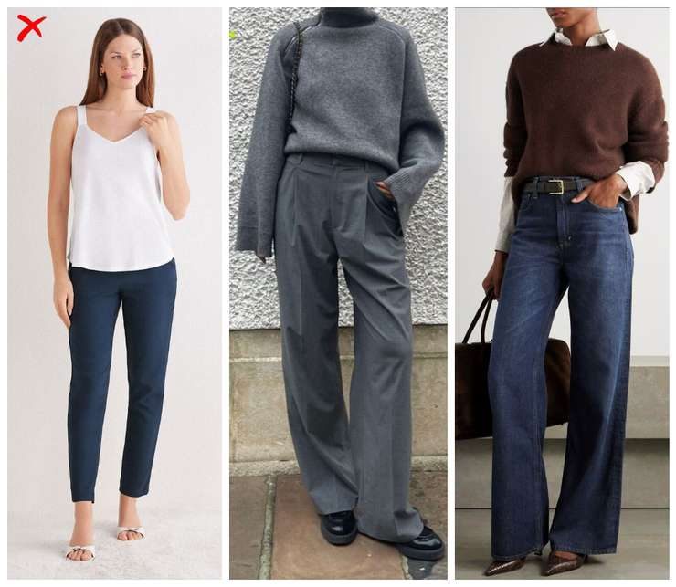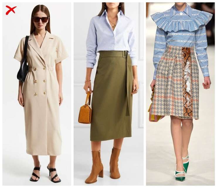Выбираем поясные изделия средней посадки и заправляем верх в пояс. Чтобы обозначить линию талии для верха и низа в образе выбираем контрастные цвета. Плюс добавляем немного объема вверху и внизу, тогда талия будет самым узким местом. Осторожно используем приталенные силуэты и не подчеркиваем талию ремнем.