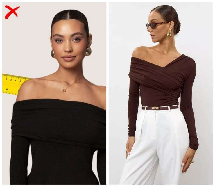 Эта часть тела является ярким элементом фигуры, который оказывает большое влияние на общее восприятие пропорций тела. Мягкие, струящиеся фактуры создадут для плечевых изделий плавные линии силуэта. Идеально, если они будут однотонными. Например, шелк или трикотаж.V-образный либо диагональный вырез смещает внимание и ломает прямую горизонтальную линию плеч. Темные оттенки будут оптически уменьшать объем и создавать ощущение легкости. А светлые оттенки, принты и фактурные ткани лучше использовать в нижней части, чтобы сбалансировать пропорции. Также в нижнюю часть добавляем объем, чтобы сбалансировать образ (накладные карманы, баска, драпировки, объемные юбки).