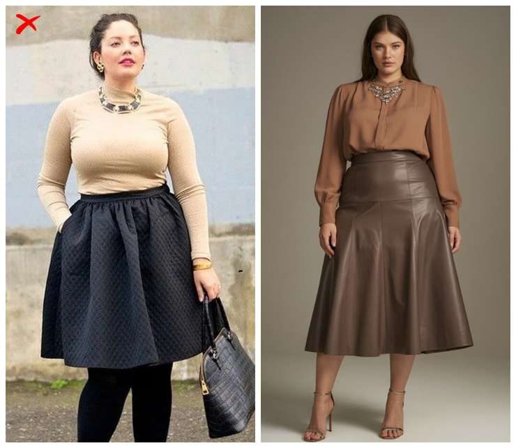 Юбки фасонов — трапеция и тюльпан. С осторожностью юбки-карандаш и клеш, которые могут прибавить объема, если их не сбалансировать также с объемным верхом. Платья А-силуэта, трапеция, на запах. Стараемся избегать в зоне бедер крупных принтов, накладных карманов и фактурной ткани (шерсть, твид, пайетки).