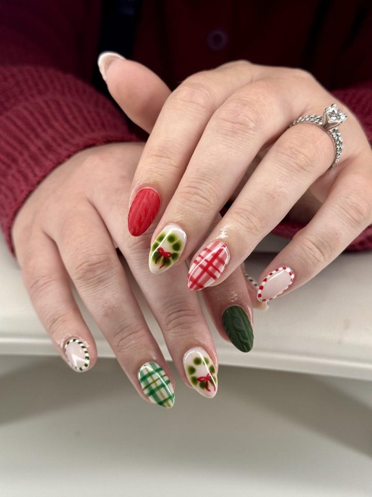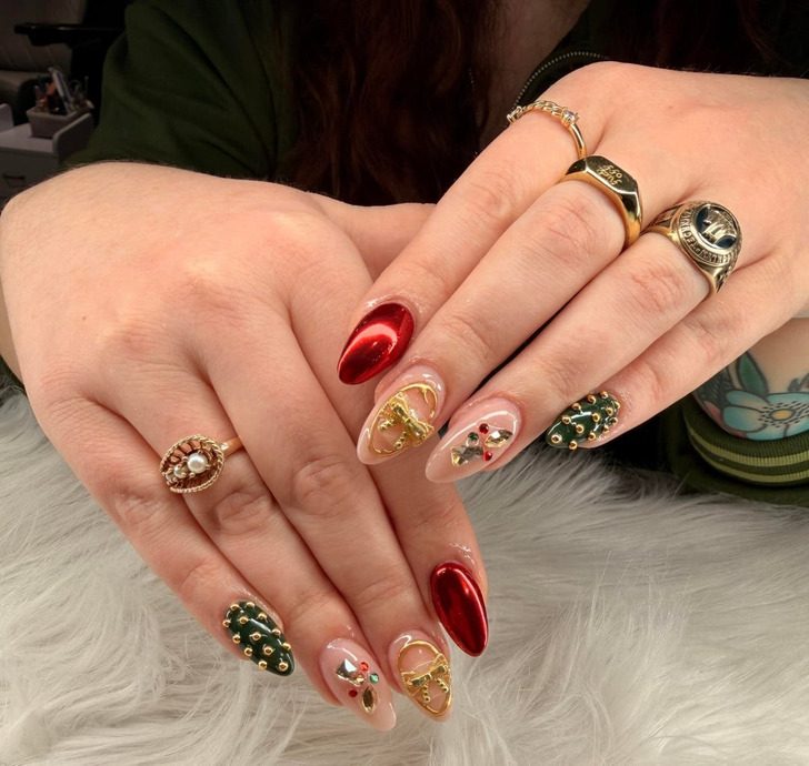 елочки на акцентных ногтях или более яркие решения. Нейл-мастер Ирам Шелтон предлагает покрасить остальные ногти в зеленый цвет, но если вы хотите добиться более изысканного вида, можете просто сделать полупрозрачное покрытие вместо этого. Этот дизайн предоставляет большую свободу для фантазии!