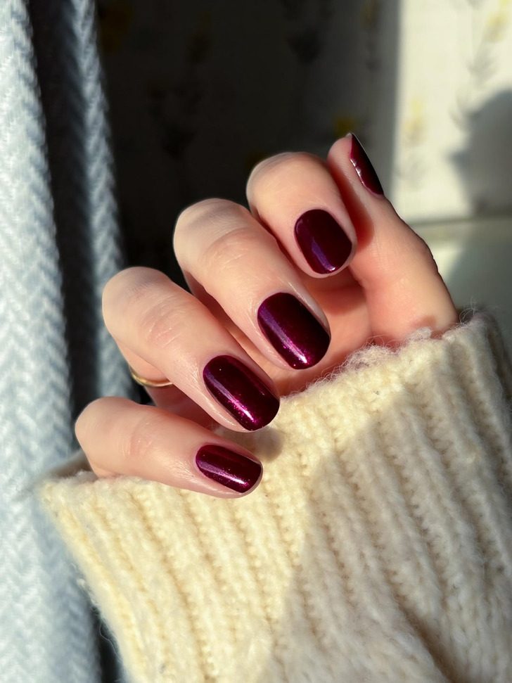 Прекрасная альтернатива классическому красному и бургунди — цвет зимних ягод. Он элегантный и в меру насыщенный. Напоминает о ярких гроздях рябины, клюквы или остролиста. Глубокий цвет красиво подчеркивает руки и выглядит роскошно. Эксперты предлагают поэкспериментировать и нанести сверху желейное покрытие, чтобы добиться еще более эффектной глубины за счет игры света.