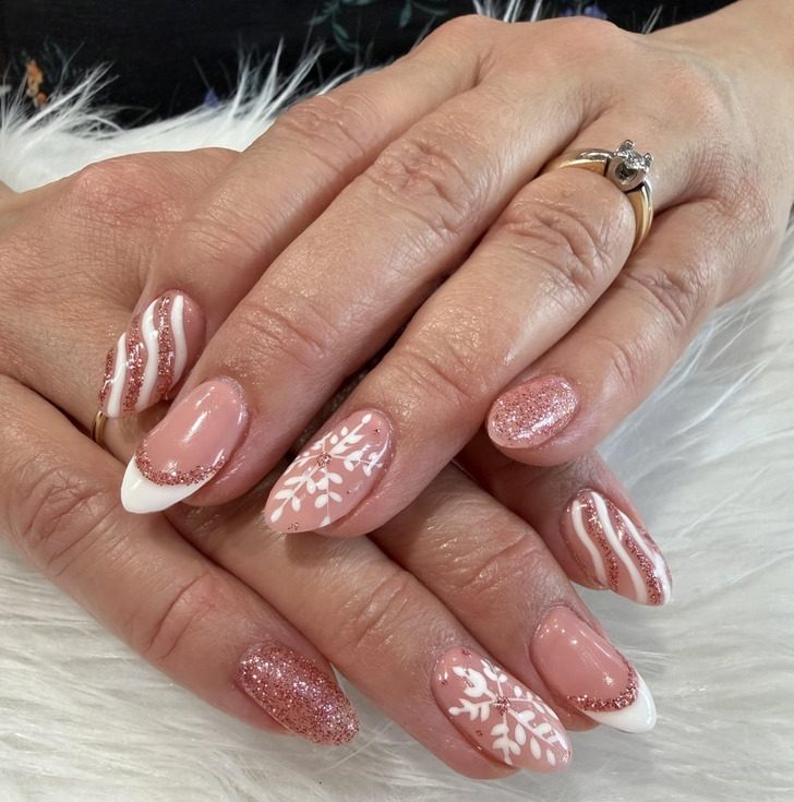 Как мы упоминали ранее, любой новогодний тренд можно смягчить, если «посадить» его на нейтральную основу. Эксперты предлагают выбирать нюдовую базу, это придает ногтям ухоженный, чистый и «дорогой» вид. Акцентами могут стать стикеры, елочки, снежинки, звезды, блестки или тонкие каемочки френча. Такой маникюр показывает, что для создания праздничного настроения достаточно всего лишь одного небольшого, но продуманного акцента.