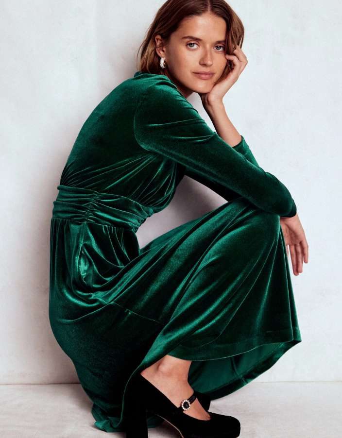 Бархат — традиционно главный материал зимних коллекций. Он одновременно универсальный и эффектный, не требует сложного кроя и выглядит дорого даже в простейших формах. «Платье-миди в изумрудном, темно-синем, винном или бутылочном цвете — идеальный баланс между спокойной элегантностью и праздничным настроением. Бархат сглаживает линии, подчеркивает силуэт, с ним не нужно много украшений — достаточно золотых серег или простой подвески. Плотные колготки, аккуратные туфли или бархатные балетки завершают образ, не перегружая его», — говорит эксперт.