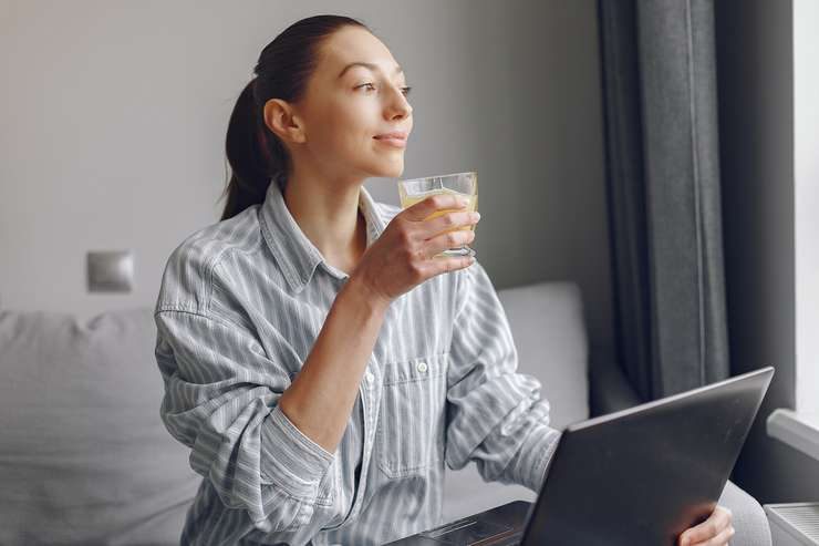 1. Теплая вода. Холодная вода зимой не лучшее решение. Пейте чистую теплую воду (35—40°C), возможно, с ломтиком лимона, имбиря или мяты. Это согревает и комфортно для пищеварения.2. Установите ритуал. Поставьте на рабочий стол красивую термокружку с теплой водой или травяным чаем (ромашка, календула, мята, шиповник, иван-чай). Цель — не выпить 2 литра за раз, а делать по несколько глотков каждые 15—20 минут.