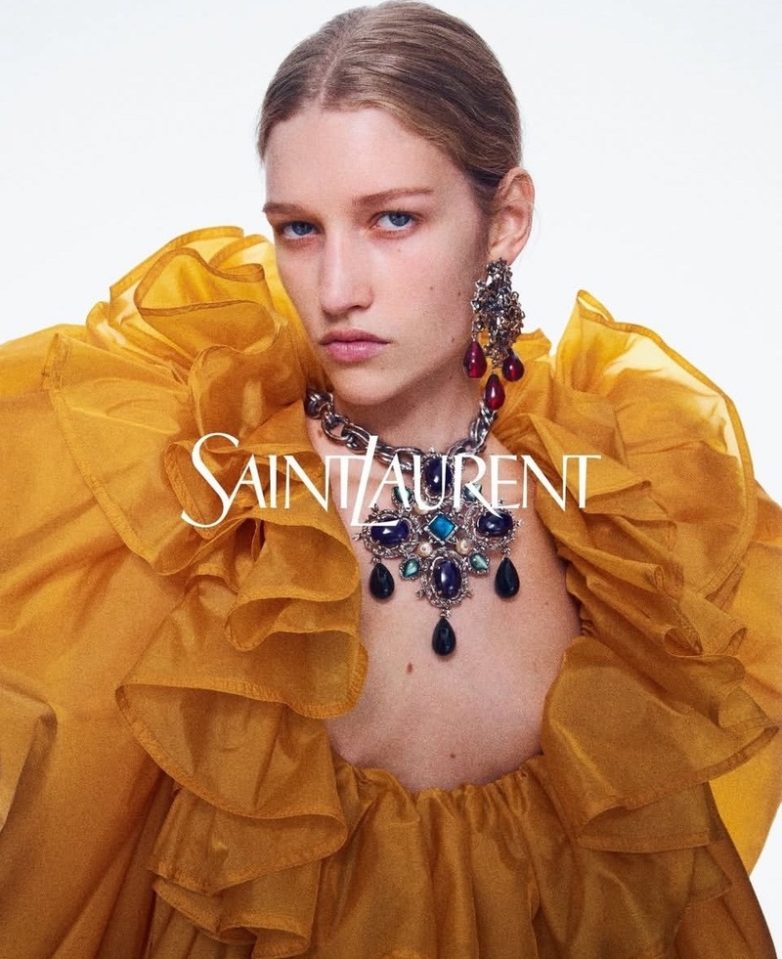 Кресты, сердечки с темными камнями, готические мотивы в современной обработке. Saint Laurent и Valentino предлагают носить их с черным или белым — для контраста. Это не мрачно, а интригующе: добавляет глубины даже простому свитеру.