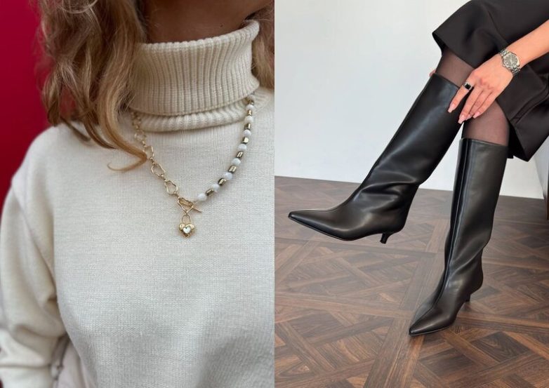 — Сапоги-чулки с острым мысом, если на вас юбка или платье.