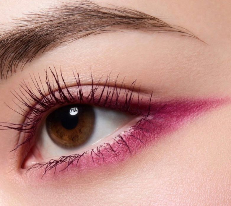 Не менее популярен вариант розового макияжа глаз со стрелкой: можно выбрать подводку черным или баклажановым оттенком.
