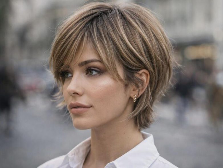 Бикси — гибрид боба и пикси, короткая текстурированная стрижка с удлиненной макушкой и мягкими слоями по бокам. В 2026 она стала смелее: больше объема, рваные края, легкая небрежность. Эта прическа популярна за игривость и адаптивность — легко укладывается в casual или гламур. Подходит для смелых натур и тех, кто хочет свежести без экстремальной короткости.