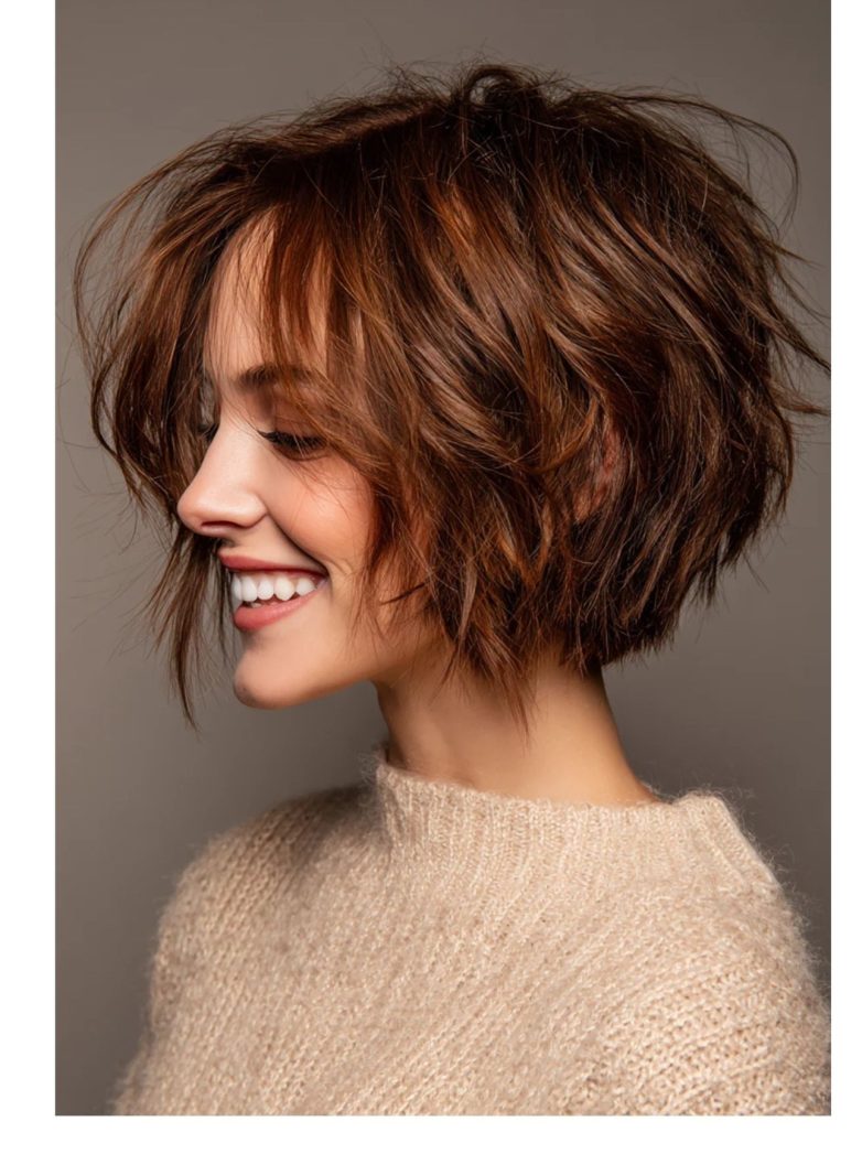 Текстурный боб — это современная версия классики: длина от подбородка до плеч, рваные края, легкая градуировка сзади для подъема и объемные слои спереди. В 2026 он стал еще более живым и дерзким — никаких идеально ровных линий, только подвижность и характер. Прическа выглядит стильно, но не строго, подходит деловым женщинам. Знаменитости вроде Хейли Бибер и Марго Робби носят его с легкой небрежностью.