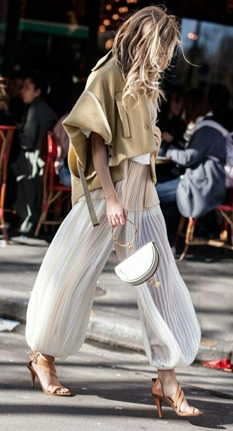 Важно следить за тем, где заканчивается объем. Если пузырь штанины опускается ниже щиколотки, образ становится тяжелым. Но в этом случае прекрасно выручает каблук или шпилька (кстати, мы уже рассказывали о модных вариантах на лето, пользуйтесь).