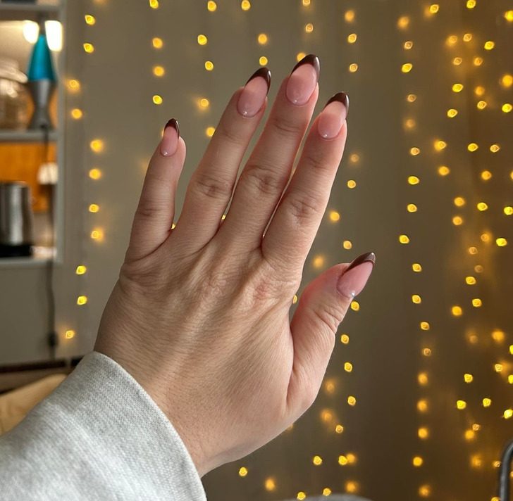 Многими любимый френч всегда в моде, а вот такой коричневый френч в оттенке эспрессо — это свежий взгляд на классику. Насыщенная коричневая «улыбка» на прозрачном нюде добавляет образу роскоши и смотрится лаконично. Это идеальный вариант, когда вам хочется сделать френч, но с изюминкой. Такой дизайн — совсем другое дело!