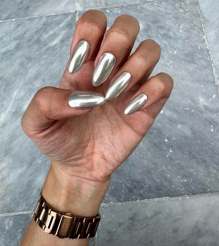 Эксперты What to Wear предлагают присмотреться именно к холодным оттенкам металлика. Такой маникюр смотрится дорого и нетривиально. Один взгляд — полный восторг! Но у нас есть хорошая новость для тех, кто делает маникюр самостоятельно: чтобы легко воссоздать такой эффект понадобятся лишь лак-металлик и специальная пудра (втирка) для финального штриха.